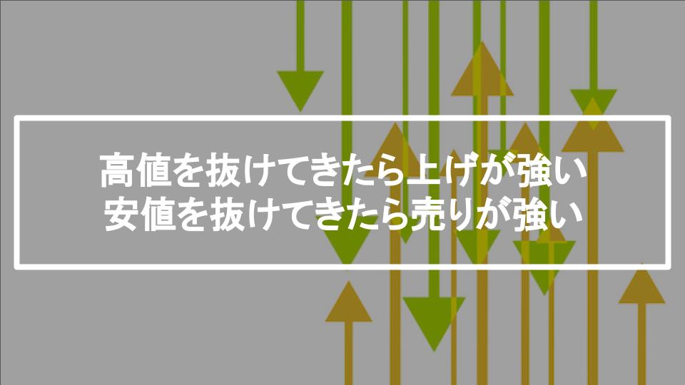 高値を抜けてきたら上げが強い、安値を抜けてきたら売りが強いという事です。