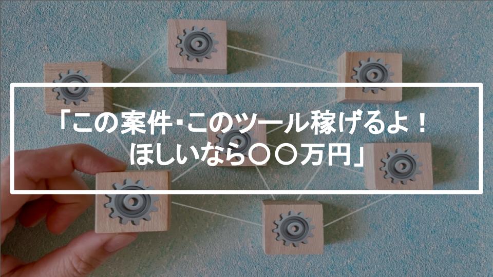 「この案件・このツール稼げるよ!ほしいなら〇〇万円」